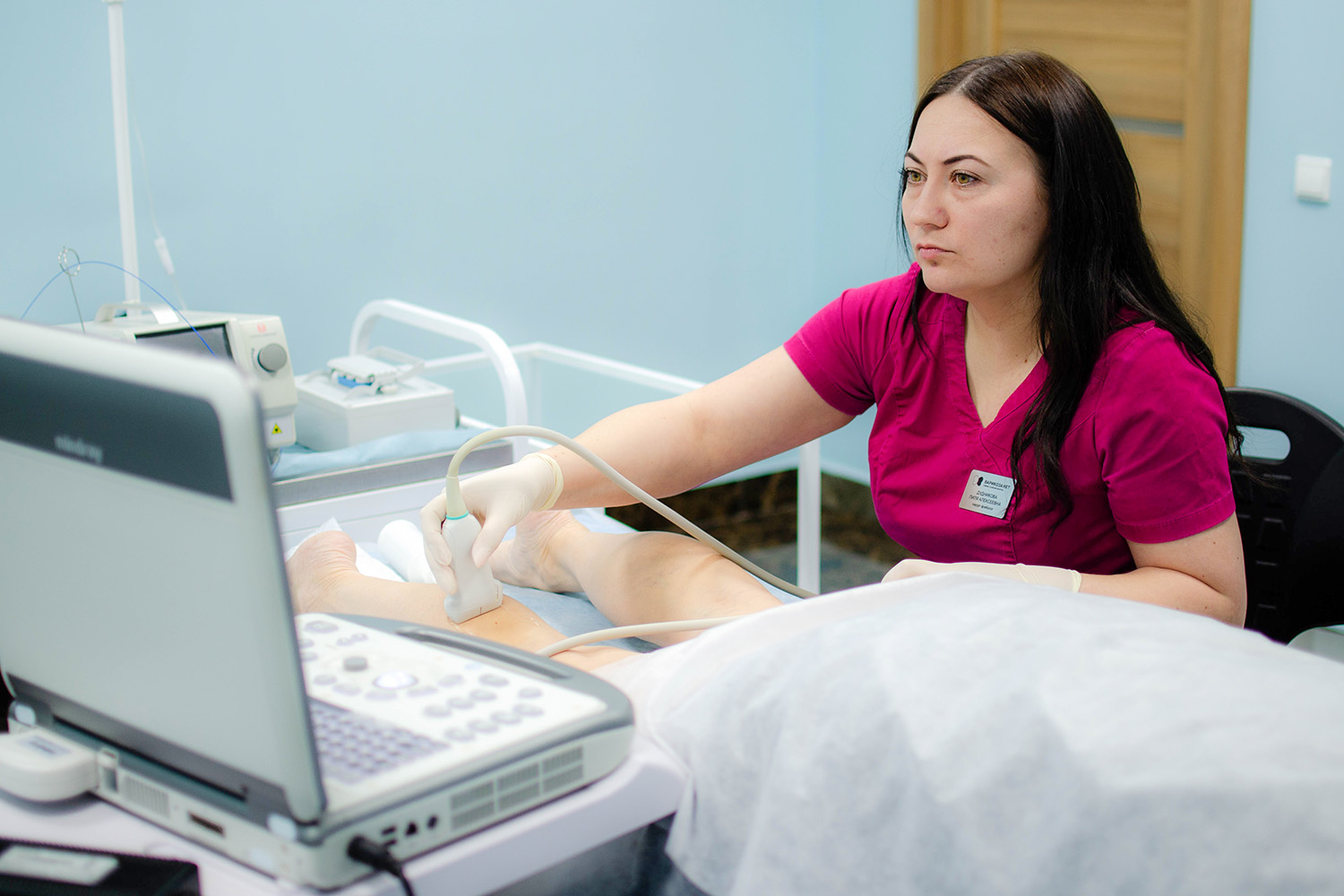 3. Врач проводит внешний осмотр ног и ультразвуковую диагностику вен на аппарате экспертного класса